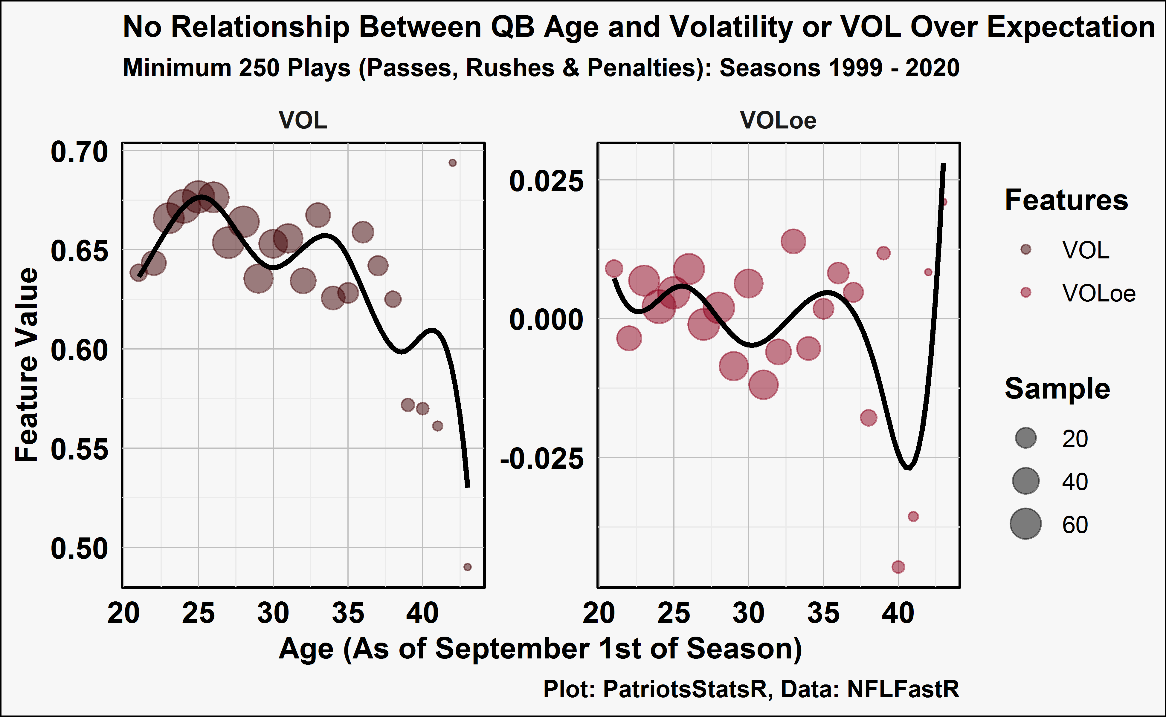 There are a lot of questions related to volatility that come to mind, but for the sake of brevity I will touch upon one that immediately comes to mind: does volatility of VOLoe change with a QB’s age? We can examine both metrics by age.
